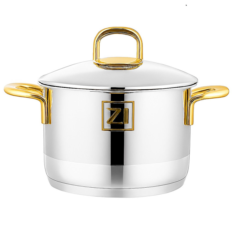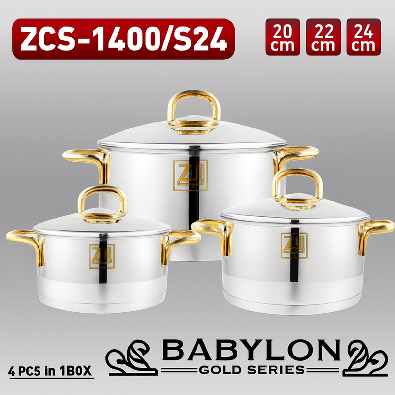 سرویس قابلمه 6 پارچه Zio مدل Z-1400 دستههای طلایی: شامل 3 قابلمه و 3 درب در سایزهای 20، 22 و 24 سانتیمتر، جنس بدنه استیل ضدزنگ 18/10، دستهها از جنس استیل با روکش طلایی (لوکس)، مجهز به کف کپسولی سهلایه (آلومینیوم) برای توزیع بهینه حرارت، دربهای پیرکس سوپاپدار، قابل استفاده بر روی تمامی اجاقها از جمله القایی (Induction) و قابل شستشو در ماشین ظرفشویی.