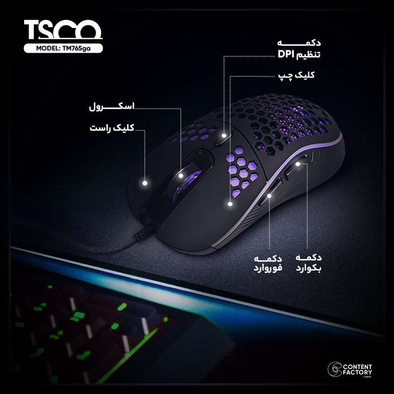 ماوسهای باکیفیت میتوانند در پیشبرد کارهای روزمره و مهم شما بسیار موثر باشند. حتی در استفاده از لپتاپهایی که تاچ پنلی با قدرت بالا دارند هم وجود یک ماوس میتواند بسیار کمک کننده باشد و سرعت شما را تا حد زیادی افزایش دهند. یکی از موسهایی که میتوان به آن اشاره کرد موسهای تولیدی شرکت تسکو است. TM765GA یک ماوس باسیم گیمینگ جمع و جور با وزن مناسب از شرکت تسکو است که بسیار مورد استفاده بازی کنندهها و گیمرهای روز دنیا قرار گرفته است. ماوس گیمینگ TM765GA تسکو یک ماوس 6 کلید بوده و مکان یابی را با استفاده از یک حسگر اپتیکال انجام میدهد و در طراحی آن LED Lighting در نظر گرفته شده است و قادر است 7200 نقطه در اینچ را مکانیابی با کنترل کلید تعبیه شده در آن کم یا زیاد کند.