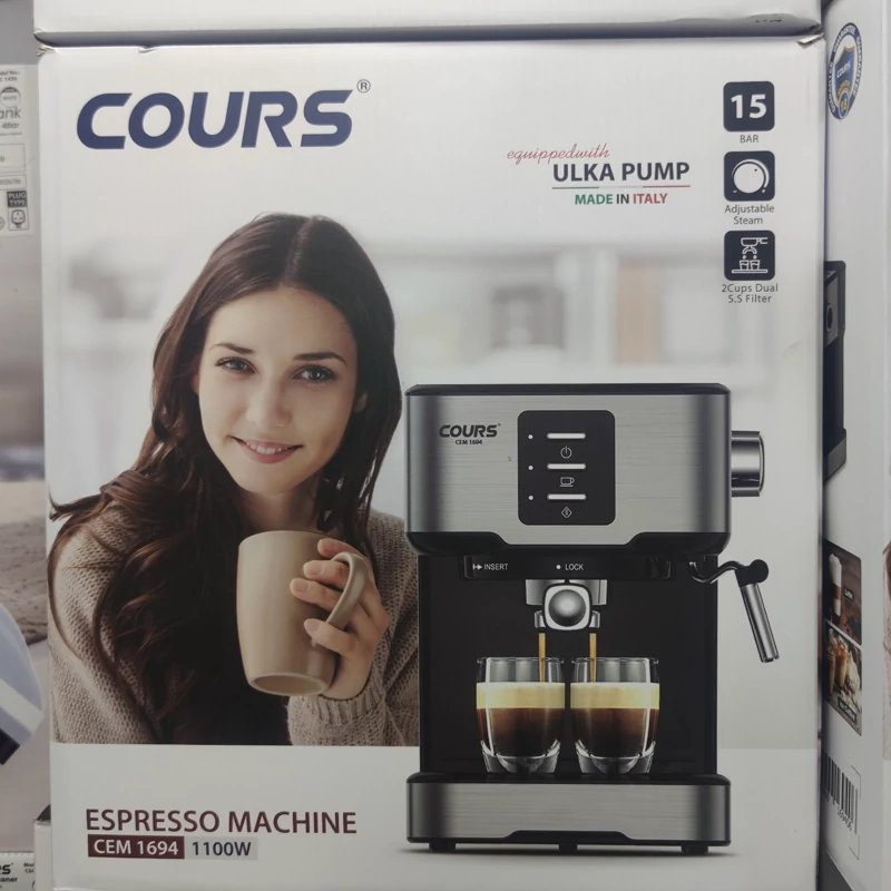 اسپرسو ساز کورس مدل CEM1694 با قدرت 1100 وات و فشار بخار 15 بار واقعی مجهز به پمپ آب ایتالیایی می باشد این دستگاه اسپرسو ساز از قطع کن اتومات برخوردار است