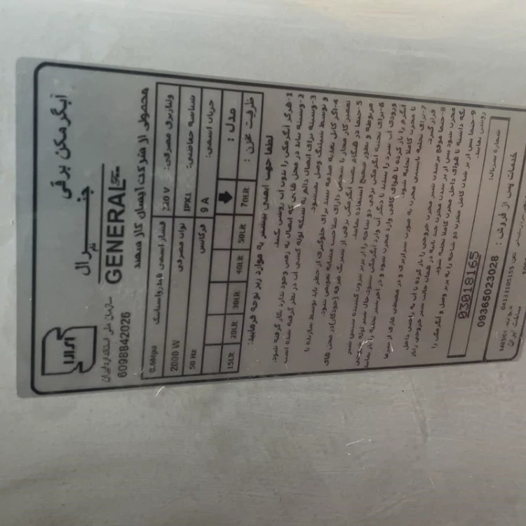 آبگرمکن برقی 70 لیتر جنرال مناسب خانه تا 80 الی 90 متر
