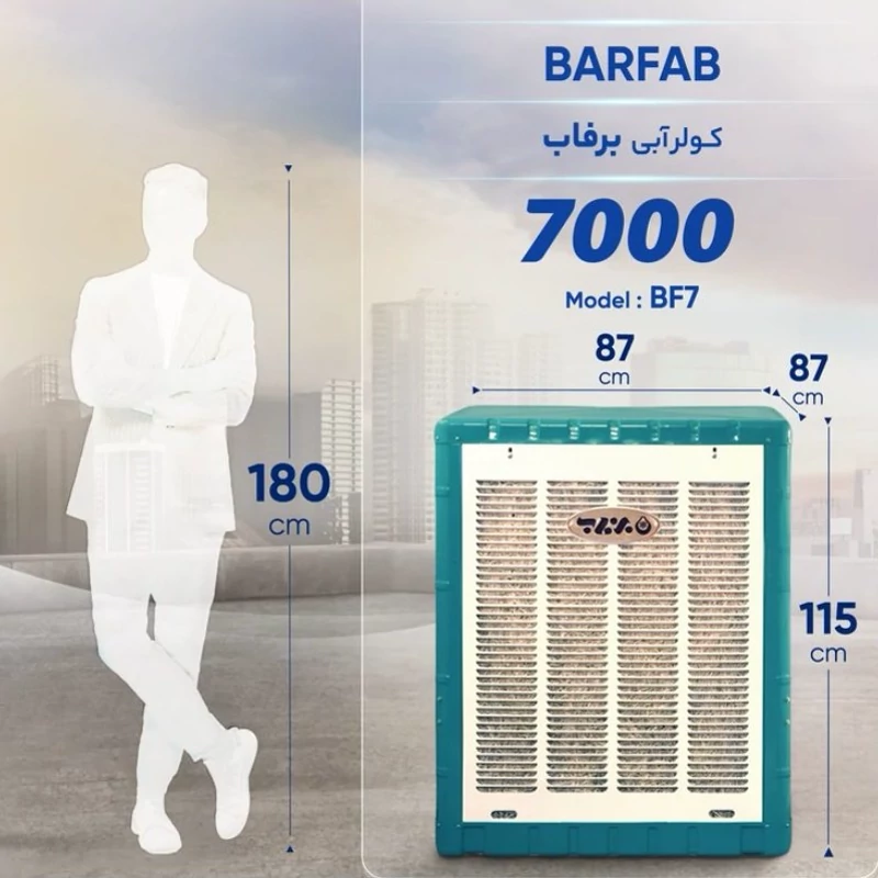 کولر 7000 برفاب دارای ابعاد بزرگ 115×87×87 سانتیمتر و با موتور پرقدرت 3/4 اسب بخار می باشد و برای فضاهایی مانند منازل، دفاتر، یا مغازهها مناسب می باشد .
