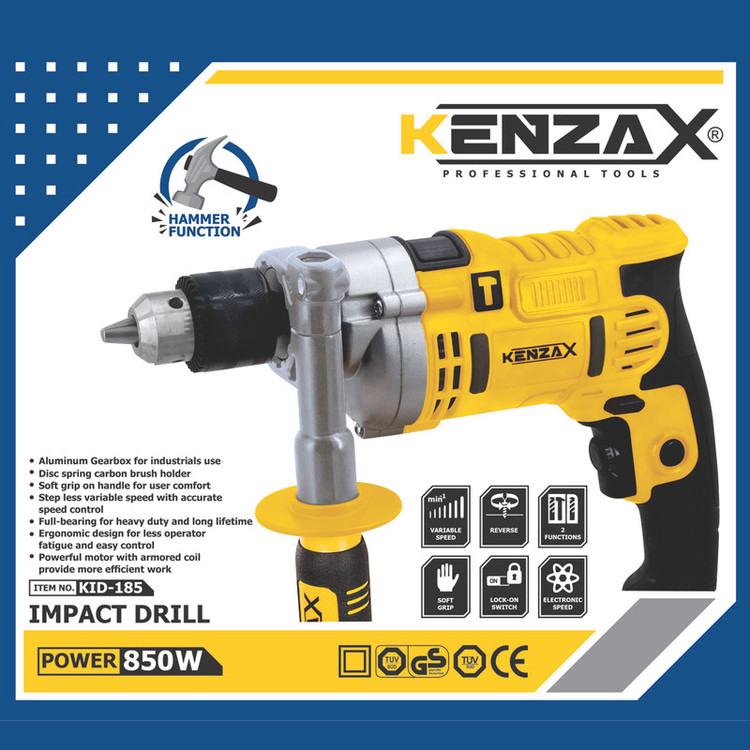 محصول فوق یکی دیگر ازمحصولات برقی تولیدی شرکت «کنزاکس» (Kenzax) میباشد. امروزه برای سوراخ کردن اجسام مختلف، از انواع دریلهای برقی یا شارژی استفاده میکنند. کار با این دستگاه کار چندان مشکلی نیست و نیاز به کسب مهارت خاصی ندارد. با توجه به میل افراد جامعه به انجام کارهای فنی در منزل، در بسیاری از خانهها نمونهای از این دستگاه دیده میشود. دریلها انواع مختلفی دارند و انرژی موردنیاز خود را از برق یا باتری میگیرند. با استفاده از دریلهای معمولی قادر به سوراخ کردن اجسامی از جنس چوب، پلاستیک یا فلزات می باشید. اما با این دریل که قابلیت سوراخ کاری در حالت چکشی را داراست علاوه بر این موارد، دیوار، سرامیک و انواع مصالح ساختمانی را میتوانید سوراخ کنید. دریل چکشی کنزاکس ابزاری مناسب برای سوراخکاری در انواع سطوح چوبی و فلزی و مصالح ساختمانی می باشد. این دریل چکشی حدود 2100 گرم وزن دارد و در ابعاد کوچک 28 × 20 × 7 سانتیمترتولید شده است . با توجه با استفاده از سه نظام فلزی مارک پیکاک حداکثر قطر سوراخکاری آن در دیوار 13 میلیمتر, چوب 25 میلیمترو در فلز 10 میلیمتراست. این دستگاه از سیستم گردشی راستگرد و چپ گرد بهره میبرد. و حالت سوراخ کاری معمولی و ضربهای را برای شما فراهم میسازد. منبع تغذیهی این دریل، برق شهری است و با ولتاژ ورودی 220 ولت کار میکند. توان خروجی این ابزار 850 وات است و میتواند با سرعت گردش صفر تا حداکثر 3100 دور در دقیقه به سوراخکاری بپردازد. برای سهولت در سوراخکاری، دستهای کمکی از جنس آلومینیوم با تزریق دو رنگ و روکش TPR ضد تعریق با قابلیت چرخش 360 درجه در قسمت جلویی دستگاه قرار دارد و از یک خط کش فلزی که عمق سوراخ کاری را تنظیم می کند بهره می برد. شرکت کنزاکس که همیشه در تولید ابزار های صنعتی نوآور است این محصول را تحت عنوان مدل «KID-185» به بازار عرضه میکند. لازم به ذکر است این دریل مخصوص کار روی فلزات ، انواع چوبها ، PVC ، مصالح بنایی از قبیل دیوار و بتن و موادی است که فشار معکوس به دریل وارد نمیکنند .