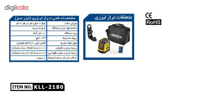 تراز لیزری فوق مدل KLL-2180 یکی از محصولات تولیدی شرکت "کنزاکس" (Kenzax) است. برد دستگاه 10 متر آزاد مجهز به لیزر از نوع دوم (CLASS II)بهترین انتخاب جهت سقف کاذب و پنل 3Dقابلیت نصب روی سه پایه با رزوه 1/4 اینچ میباشد . لیزر بهکار رفته در این محصول برنگ سبز و از نوع کلاس 2 بوده و بدنه ارگونومیک تمام پوشیده شده از روکش نرم است و برای تامین انرژی از 2 باتری قلمی استفاده میکند. برد این تراز لیزری 10 متر بوده و با کمک نشانگر مخصوص، این برد به میزان 40 متر افزایش مییابد. دستگاه دارای پایه آهنربایی چند کاره جهت نصب روی تکیه گاه های فلزی است . تراز لیزری کامپکت (افقی و عمودی) KLL-2180 و توانایی استفاده هر کدام به صورت مجزاست . این تراز از درجه حفاظت IP55 بهره میبرد. حداکثر زمان کار مداوم (دیودها) 8 ساعت میباشد. این محصول دارای سیستم پاندولی هوشمند جهت تراز شدن اتوماتیک و خودکار با دقت بالا و نشان دادن دقیق وضعیت های غیر ترازمیباشد . مجموعه ی فوق دارای کیف جابجایی از جنس برزنت میباشد .