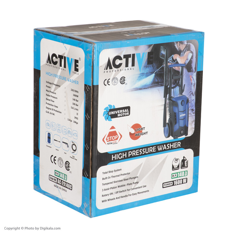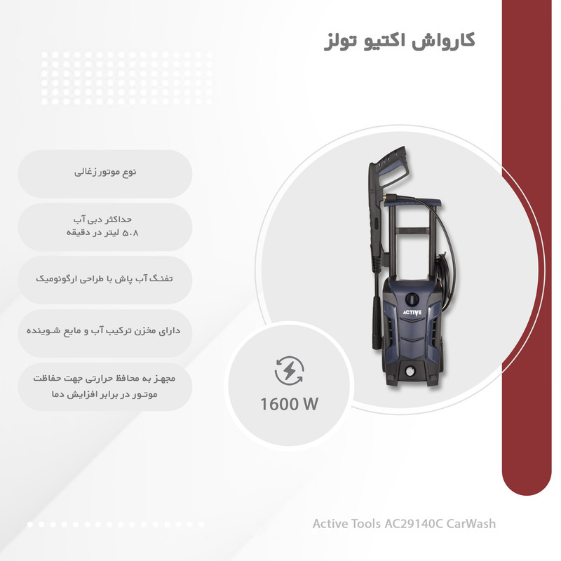کارواش خانگی اکتیو مدل AC-29140C محصولی از مجموعه ابزار آلات اکتیو میباشد که جهت شستشوی شستشوی خودرو، موتور سیکلت، ساختمان از قبیل حیاط، دیوار، پارکینگ، راهرو و ... استفاده می شود. از مهمترین عوامل از استفاده از این دستگاه میتوان به بهینه سازی در وقت و انرژی و همچنین صرفه جویی در مصرف آب اشاره نمود.کارواش های خانگی اکتیو مدل AC-29140C معمولا دارای موتور یونیورسال(ذغالی) , بوده و بیشتر جهت مصارف خانگی به کار برده میشود.کارواش خانگی AC-29140C یکی از پرفروش ترین کارواش های خانگی در بازار ایران می باشد. این دستگاه پرقدرت، کم وزن و بادوام جهت مصارف خانگی به شمار میرود. کارواش خانگی اکتیو مدل AC-29140C دادرای موتوری با توان 1600 وات و فشار خروجی آب با قدرت 140بار میباشد. همچنین موتور این کارواش دارای محافظ حرارتی جهت محافظت موتور در برابر افزایش دما میباشد.حمل و جابجایی این دستگاه براحتی انجام میشود به علت وجود دسته جهت حمل، وجود چرخ های با دوام و نیز وزن نسبتا سبک این دستگاه که دیگر کاربر نگران جابجایی این دستگاه حتی در حین شستشو نمیباشد. طول کابل این دستگاه 5متر میباشد تا بتوان بدون نیاز به سیم سیار در فواصل دور تر نیز از این دستگاه استفاده نمود.از بزرگترین محاسن استفاده از کارواش 140بار اکتیو مدل AC-29140C،70% صرفه جویی در مصرف آب به دلیل میانگین مصرف آب در این کارواش 5.8 لیتر در دقیقه میباشد. کارواش خانگی AC-29140C اکتیو دارای تمامی متعلقات جانبی جهت راه اندازی و استفاده از این دستگاه میباشد. متعلقاتی از قبیل گان و لنس (تفنگی) جهت پاشش افشان و نیزه ای، گوپلینگ اتصال شلنگ به کارواش، شلنگ فشار قوی 5متری با کیفیت از جنس پی وی سی، سوزن پاک کننده و .... میباشد تا کاربر با خیالی آسوده به همراه این متعلقات از دستگاه کارواش اکتیو استفاده نماید.توجه: این دستگاه قابلیت گرم کردن آب را ندارد؛ درصورت قصد شستشو با آب گرم میتوان آب ورودی این دستگاه را تا دمای 40 درجه سانتیگراد گرم کرده و از محصول استفاده نمایید.