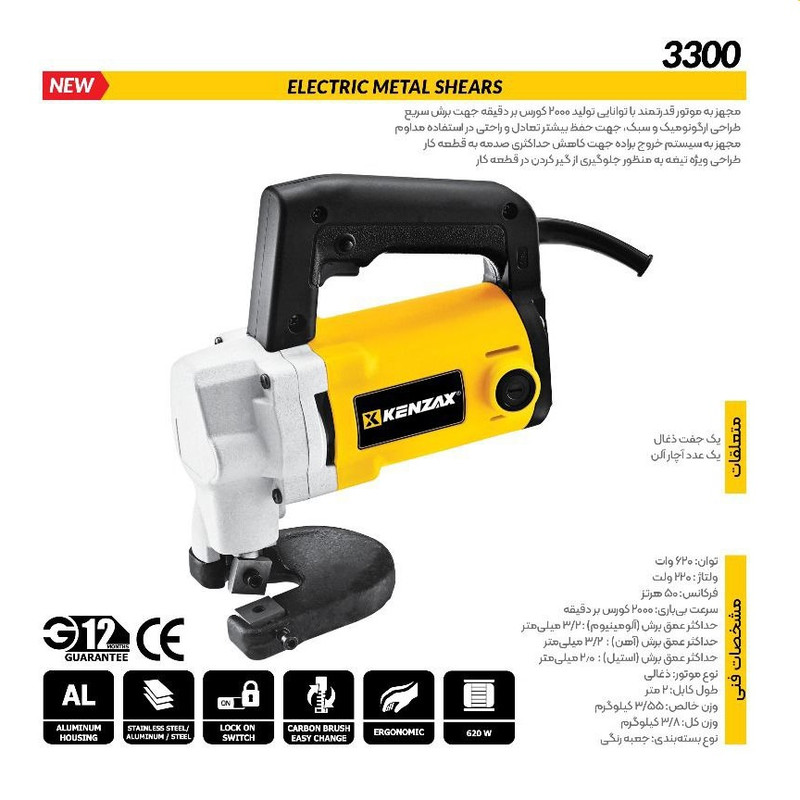 قیچی برقی کنزاکس مدل 3300، امکان ایجاد برشهایی تا عمق 3.2 میلیمتر در آهن، تا 2 میلیمتر در استیل و تا 3.2 میلیمتر در آلومینیوم را دارد. موتور 620 واتی این دستگاه سرعت 2000 کورس بر دقیقه با فرکانس 50 هرتزی را برای شما فراهم میآورد.