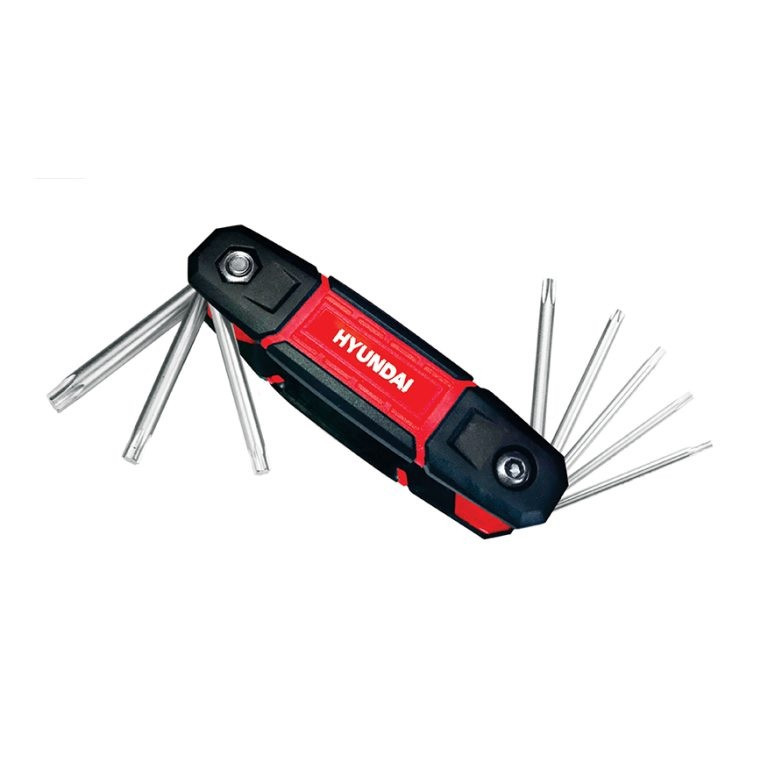 آچار آلن ستاره ای مشتی هیوندای دارای 8 عدد آلن به سایز های T9,T10,T15,T20,T25,T27,T30,T40 می باشد که از آلیاژ کروم وانادیوم ساخته شده است.داری دسته نرم و ضد تعریق برای سهولت کار می باشد