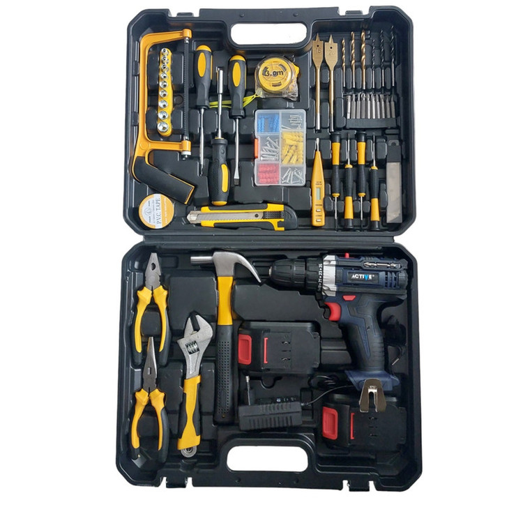 دریل پیچ گوشتی شارژی اکتیو مدل AC-3520S دارای دو باطری 20 ولت لیتیومی است.این محصول دارای 65 عدد لوازم مصرفی که داخل کیف BMC می باشد. شامل دم باریک ،انبردست ،آچار فرانسه،چکش میخ کش،2عدد پیچ گوشتی ؛دسته بکس پیچ گوشتی به همراه 9 عدد بکس، کمان اره،کاتر تیغ کاتر، تستر برق،پیچ گوشتی ترمینالی، متر،چسب برق،مته آهن 3عدد ، مته چوب 3عدد،تک پیچ گوشتی 10عدد