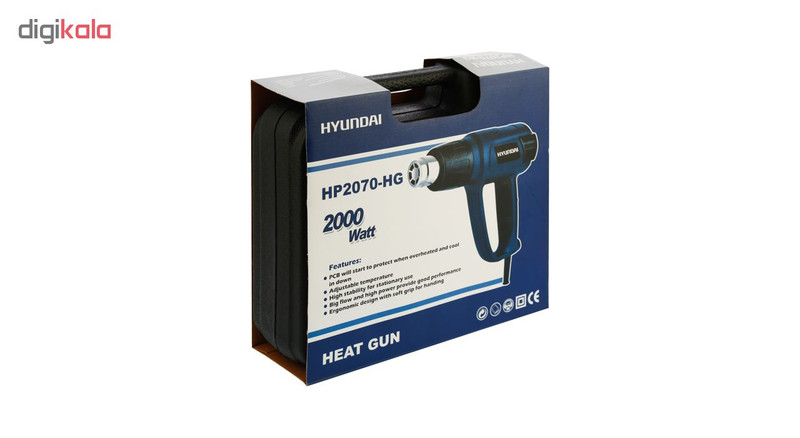 « سشوار صنعتی هیوندای مدل HP2070-HG » دارای توان 2000 وات و دارای قابلیت تنظیم حرارات خروجی از 50 درجه سلسیوس الی650 درجه سلسیوس هست. وزن سبک و خوشدستی این دستگاه باعث شده تا کاربر با کنترل بهتر و عدم خستگی با این وسیله کار کند بدنه این دستگاه عایق دویل میباشد و از جنس PA6+GF30 که بهترین مواد جهت ساخت بدنه ابزار آلات برقی هست استفاده شده است. دسته این دستگاه دارای روکش نرم ضد عرق دست میباشد. این دستگاه قابلیت تنظیم مقدار دمیدن هوا در سه حالت مختلف را دارد تا در کارهای مختلف بر اساس نیاز مقدار دمیدن هوا را تنظیم نمود. همچنین این دستگاه دارای دکمه تنظیم مقدار حرارت است که توسط چراغ های ال ای دی مقدار حرارات دمیده شده نیز به سهولت نمایان میشود. قابلیت تنظیم حرارت و خروجی میزان هوا در دو حالت مختلف است. در حالت اول در دمای 50 درجه سیلیسیوس میزان خروجی هوا 250 لیتر بر دقیقه و در حالت دوم در دمای 50 تا 650 درجه سیلیسیوس میزان خروجی هوا 500 لیتر بر دقیقه هست.