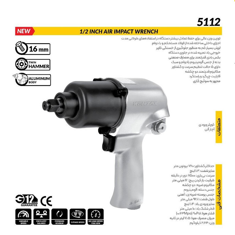 بکس بادی شفت بلند کنزاکس مدل 5112، با حداکثر گشتاور 760 نیوتن متر، ظرفیت باز کردن پیچهایی تا 16 میلیمتر را دارد. این بکس بادی با سایز شفت 1.2 اینچ و ورودی باد 1.4 اینچ با فشار هوای90 ، 7.5 لیتر در ثانیه مصرف هوا دارد. مکانیزم ضربه این بکس بادی دو چکشه میباشد.