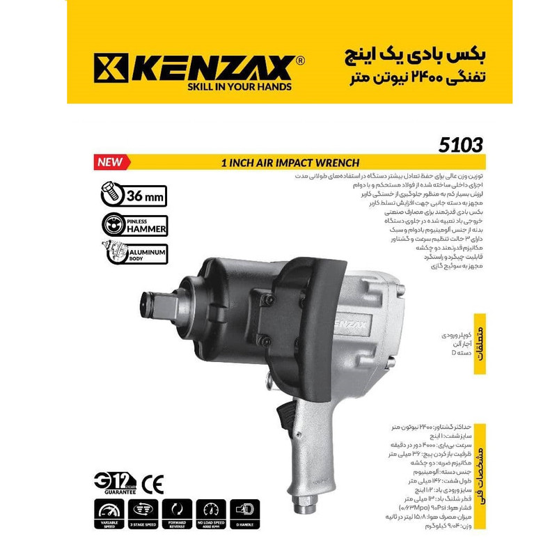 بکس بادی تفنگی کنزاکس مدل 5103، با حداکثر گشتاور 2400 نیوتن متر، ظرفیت باز کردن پیچهایی تا 36 میلیمتر را دارد. این بکس بادی با سایز شفت 1 اینچ و ورودی باد 1.2 اینچ با فشار هوای 90psi، 15.8 لیتر در ثانیه مصرف هوا دارد.
