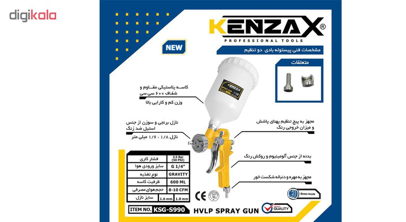 پیستوله بادی مدل KSG-990-16 محصولی است که توسط شرکت کنزاکس (KENZAX) عرضه شده است . سوزن استیل ضد زنگ که استفاده شده که باعث عمر بیشتر این پیستوله میشود . برای استفاده از این محصول باید یک پمپ یا کمپرسور باد داشته باشید. سپس پیستولهی رنگ را با شلنگهای مخصوص به کمپرسور متصل کنید. از مزایای KSG-990-16 کنزاکس میتوان به دنباله شلنگ خور آن اشاره نمود. مخزن این محصول را با رنگ پر کرده و رنگآمیزی را شروع کنید.استیل مقاومت بالایی در برابر خوردگی و فشار دارد. این محصول دارای تنوع در قطر نازل (6.1 و 1.8) میلیمتر بسته به کاربری میباشد . از جمله مزایای KSG-990-16 میتوان به کاسه (مخزن) رنگ پلاستیکی شفاف و مقاوم با ظرفیت 600 میلی لیتر اشاره نمود. این پیستوله اقتصادی ترین پیستوله موجود در بازار است. شما میتوانید رنگ موردنظرتان را در مخزن این پیستوله بریزید و با اتصال محصول به کمپرسور هوا، رنگ را بر روی سطوح مختلف بپاشید. از مزایای این محصول میتوان به وزن کم و کارایی بالا اشاره نمود . در واقع فشار هوای بالایی که کمپرسور تولید میکند از مخزن عبور کرده و باعث میشود محتوای آن با فشار خارج و به شکلی یک دست بر روی سطح اسپری شود. پیستوله سایه پاش مدل KSG-990-16 کنزاکس مجهز به دو تنظیم جهت میزان خروجی و تنظیم پهنای پاشش رنگ میباشد. شرکت کنزاکس ازجملهی عرضهکنندگان مطرح داخلی درزمینهی انواع ابزارهای دستی، بادی و برقی است. این شرکت با معرفی محصولاتی که ازنظر کیفیت در سطح قابلقبولی قرار دارند و با قیمتی مناسب عرضه میشوند، جایگاه مناسبی در بازار ایران برای خود ایجاد کرده است.