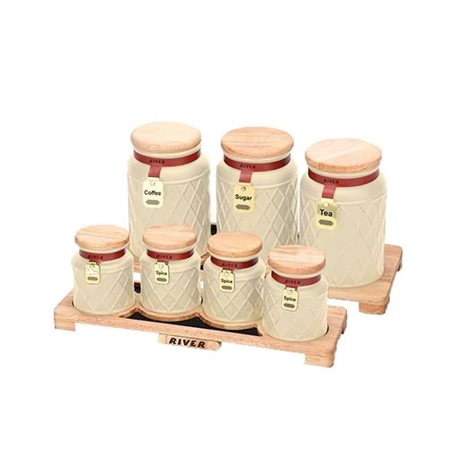 شامل ۸ قطعه: مجموعه بانکههایی با ابعاد متنوع برای نگهداری چای، قند، شکر، ادویه، دمنوش و سایر مواد خشک؛