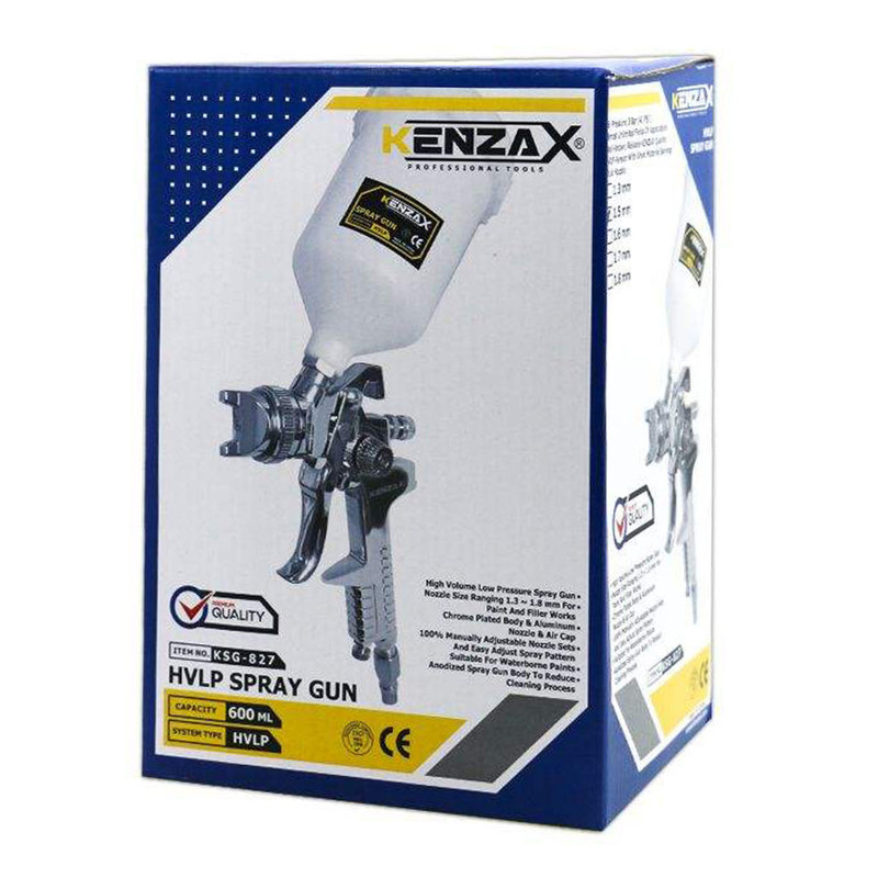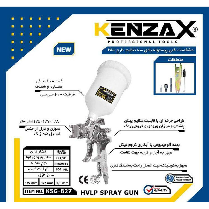 پیستولههای برقی یا بادی ازجملهی وسایلی هستند که از آنها برای نقاشی و رنگآمیزی سطوح مختلف استفاده میشود. استفاده از این ابزار سرعت عمل نقاش را بالا میبرد. البته در خصوص ییستولههای بادی باید در نظر داشت که به یک منبع یا کمپرسور باد احتیاج دارند. یکی از پیستولههای رنگ که توسط شرکت کنزاکس (KENZAX) تولید میشود، مدل KSG-827است. این محصول دارای تنوع در قطر نازل (5/7،1/1 و 1.8) میلیمتر بسته به کاربری میباشد . از جمله مزایای KSG-827 میتوان به کاسه (مخزن) رنگ پلاستیکی شفاف و مقاوم با ظرفیت 600 میلی لیتر اشاره نمود . همچنین بدنه ی آلومینیومی این محصول دارای روکشی از آلیاژ کروم نیکل میباشد که هنگام شستشو در تینر باعث عدم خوردگی آن میگردد. سوزن این محصول از جنس استیل ضد زنگ ، نازل از جنس برنج ساخته شده است. در ساخت این پیستوله کنراکس KSG-827 از تکنولوژی HVLP بهره برداری شده است که با کمترین میزان فشار بیشترین پاشش رنگ را امکان پذیر می نماید . سوزن استیل ضد زنگ که ستفاده شده که باعث عمر بیشتر این پیستوله میشود . همچنین مخزن این مدل 600 میلیلیتر رنگ را در خود جای میدهد. برای استفاده از این محصول باید یک پمپ یا کمپرسور باد داشته باشید. سپس پیستولهی رنگ را با شلنگهای مخصوص به کمپرسور متصل کنید. از مزایای KSG-827 کنزاکس میتوان به دنباله شلنگ خور آن اشاره نمود . مخزن این محصول را با رنگ پر کرده و رنگآمیزی را شروع کنید. به همراه این محصول، چند قطعه لوازم جانبی شامل آچار، فرچهی کوچک و فیلتر قرار دارد که به کمک آنها، میتوانید استفادهی بهتری از پیستوله کرده و آن را به راحتی تمیز کنید. از آچار برای باز کردن قطعات و از فرچهی کوچک برای تمیز کردن قطعات بازشده استفاده میشود. فیلتر کوچک هم برای قرار گرفتن در محل اتصال مخزن به پیستوله در نظر گرفتهشده و از ورود اجسام ریز به داخل پیستوله جلوگیری میکند. شما میتوانید برای سرعت دادن به روند رنگآمیزی، بهجای استفاده از قلمموی رنگ از پیستولهی بادی مانند پیستوله بادی کنزاکس مدل KSG-827استفاده کنید. جنس فلزی بدنه و نازل استیل در این محصول، باعث مقاومت و عمر بسیار بالای آن میشود. مخزن پلاستیکی این محصول حجم مناسبی از رنگ (600 سیسی) را در خود جای میدهد.