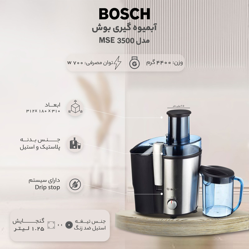 آبمیوه گیری بوش مدل «MES3500» از محصولات پرفروش و پرطرفدار این شرکت است که در کنار طراحی زیبا، کیفیت ساخت بالایی هم دارد. این آبمیوه گیری دارای دو مخزن آبمیوه و تفاله است که هر کدام به گونهای مجزا از دستگاه در کنار آن قرار گرفتهاند. قابلیت جدا شدن مخزنها علاوهبر نظافت آسانتر، ظرفیت بیشتری را هم در اختیار دارندگان آن قرار میدهد. لازم به ذکر است که تیغه اصلی این دستگاه آب میوه گیری از جنس استیل ضد زنگ بوده و دهانه آن هم از قطر مناسب برخوردار است. علاوه بر فیلتر آب میوه گیری که به راحتی قابل شست و شو است، میتوان لوازم جانبی آن را هم در ماشین ظرفشویی قرار داد. برای این دستگاه اقلام همراهی نظیر مخزن پلاستیکی آبمیوه که شفاف و دارای درجه بندی است و همچنین مخزن تفاله آبمیوه گیری در نظر گرفته شده که به راحتی میتوان آنها را پس از پر شدن از دستگاه جدا کرد و پس از وقفهای کوتاه آنها را خالی و برای ادامه فرآیند آبمیوه گیری روی دستگاه قرار داد. آبمیوهگیری بوش مدل «MES3500» دستگاهی تککاره است و میتوان توان آن را در دو سرعت تنظیم کرد. پایههای ضد لغزش زیر این دستگاه مانع از لرزش و جابجایی آن حین کار میشود. لوله خروجی دستگاه و پارچ آبمیوه آن طوری طراحی شدهاند تا آبمیوه مستقیم وارد پارچ شده و چکهای ایجاد نشود. لازم به ذکر است که ظرفیت پارچ این آب میوه گیری بوش حدود 3 تا 4 لیوان کوچک یا متوسط است.