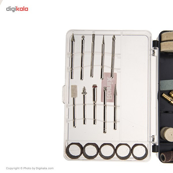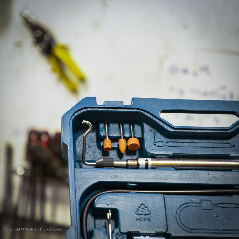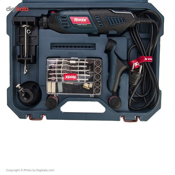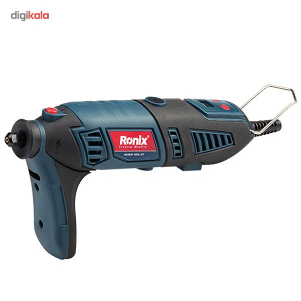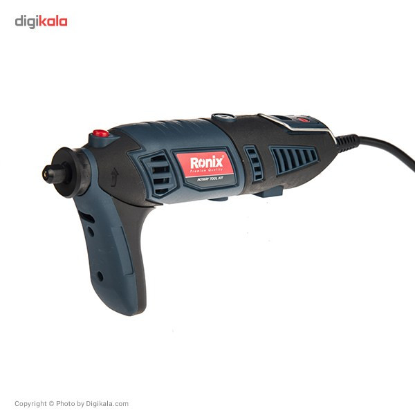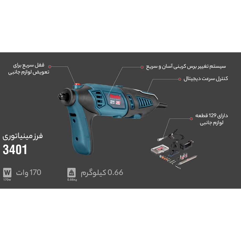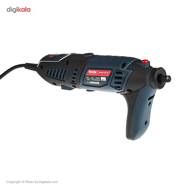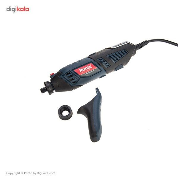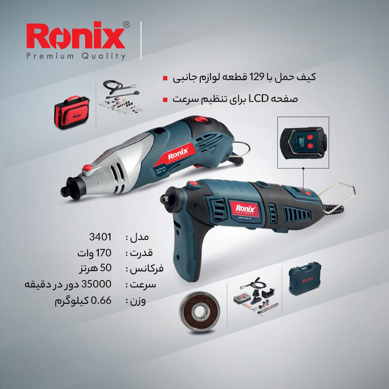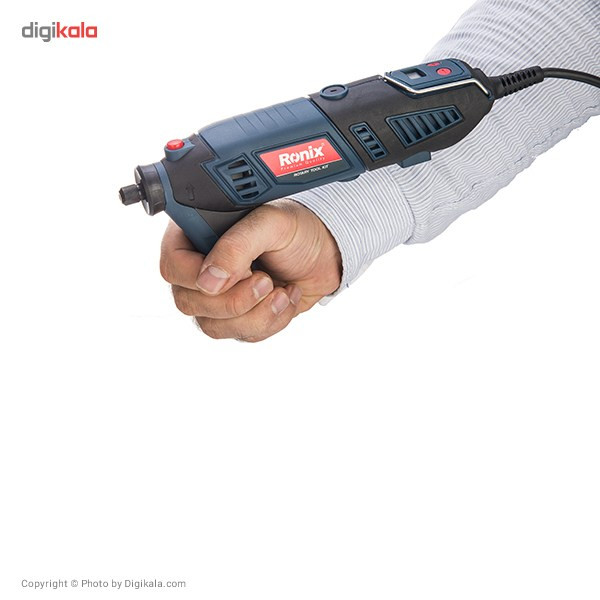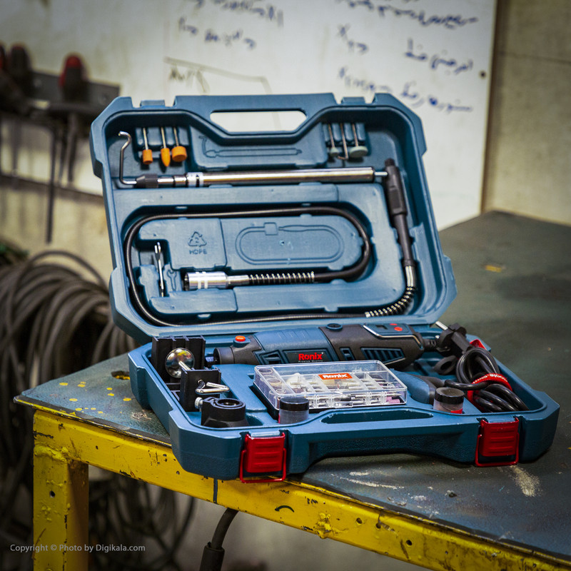 این محصول، یک فرز مینیاتوری به همراه مجموعهی کاملی از ابزار و وسایلی است که برای انجام کارهای مختلف، مورداستفاده قرار میگیرد. این دستگاه که با عنوان 3401 معرفیشده، توسط شرکت «رونیکس» (Ronix) تولید میشود. این دستگاه به یک موتور، با قدرت مناسب مجهز است که میتوان سرعت گردش آن را بهصورت دیجیتالی تنظیم کنید. 3 کولت برای کار در شرایط مختلف برای این محصول در نظر گرفتهشده است. علاوه بر این تعداد زیادی از انواع لوازم جانبی به همراه این ابزار عرضه میشود. فرز مینیاتوری مدل 3401 یک دستگاه چندکاره بهحساب میآید. از این دستگاه غالبا برای انجام کارهایی با دقت و ظرافت بالا استفاده میشود. ازجمله این موارد میتوان به برشهای دقیق فلزات و چوب، دادن طرحهای مختلف در چوب، انواع سوهانکاری و بسیاری موارد دیگر اشاره کرد. این محصول موتوری با قدرت 170 وات دارد. حداکثر سرعت گردش موتور به 35000 دوربردقیقه میرسد. سرعت گردش موتور دستگاه را میتوان به کمک بخش دیجیتالی انتهای دسته بین 8000 تا 35000 دوربردقیقه تنظیم کرد. با توجه به اینکه کاربرد این دستگاه در انجام کارهایی با ظرافت بالا است، میتوان با اتصال یکی از 3 گونهی کولت (سری دستگاه) به محصول، نیاز به در دست گرفتن دستگاه را برطرف کرد. در کنار این محصول 122 عدد لوازم جانبی هم وجود دارد. گونههای مختلف سنگ سنباده و برش، متههایی با قطر بسیار کم، صفحههای سنباده، دو نوع فرچه و انواع پایههای مخصوص دستگاه در بیت این 122 عدد لوازم جانبی دیده میشود. با استفاده از پایههای قرارگرفته در این مجموعه، میتوانید دستگاه را به چند حالت معلق، روی میز و عمودی استفاده کرد.
