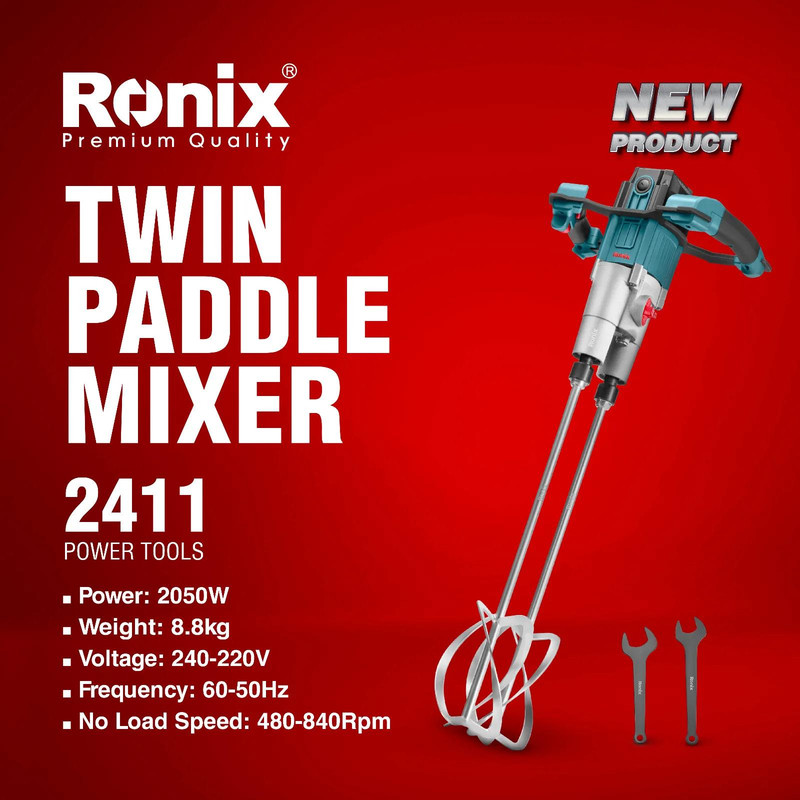 میکسر برقی دو محوره صنعتی 2411 رونیکس ابزاری کارآمد برای مخلوط و ترکیب کردن مواد و مصالح مختلف است. سرعت این دستگاه با موتور 2050 واتی، در حالت بیباری به 840 دور بر دقیقه میرسد.