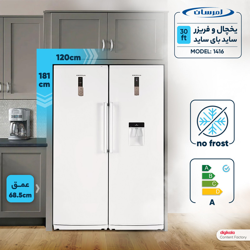 علاوه بر این، یخچال و فریزر دوقلو 30 فوت امرسان مدل 1416 به سیستم عایقبندی پیشرفته مجهز است که از هدررفت سرما جلوگیری کرده و باعث افزایش کارآیی انرژی میشود. این ویژگی در کنار سیستم سرمایشی کارآمد، صرفهجویی قابلتوجهی در مصرف برق را به ارمغان میآورد.
