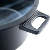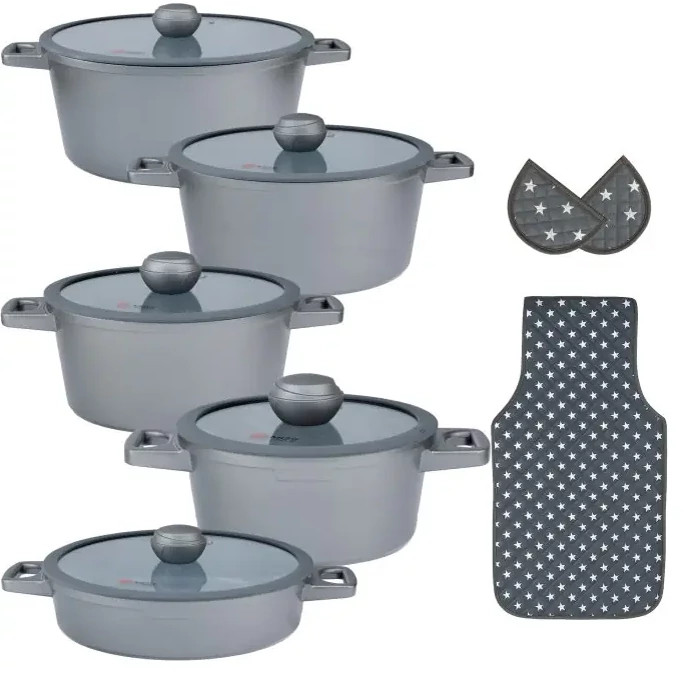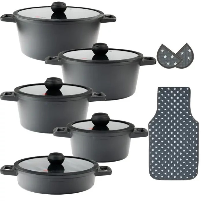 بدنه این سرویس از آلومینیوم با کیفیت بالا ساخته شده و به روش دایکست (Die-Cast) تولید شده است. این نوع ساختار باعث میشود قابلمهها استحکام بالا، وزن مناسب و انتقال حرارت یکنواخت داشته باشند. پخش یکنواخت حرارت در کف و بدنه قابلمهها کمک میکند غذاها بهتر پخته شوند و از سوختن یا نیمپز شدن مواد غذایی جلوگیری شود.